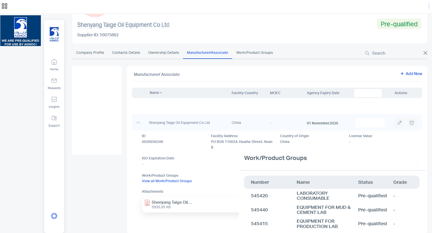 We are happy and proud to anounce that laboratory equipment and parts of Shenyang Taige Oil Equipment have been successfully prequalified after our continuous follow-up with the ADNOC PQ team.
